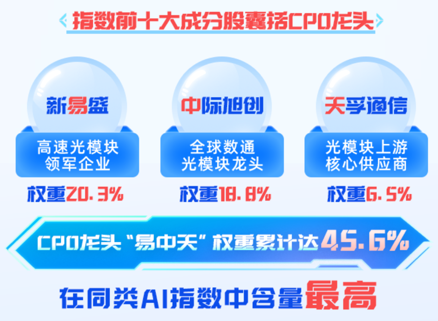 这只基金追踪的创业板人工智能指数,前十大成分股里,“易中天”光模块龙头占了45.6%的权重。这意味着,如果看好光模块板块,它是能充分覆盖的。而且不仅仅是光模块,它还把AI算力、云服务等上下游环节囊括进来,做到了全产业链的覆盖。