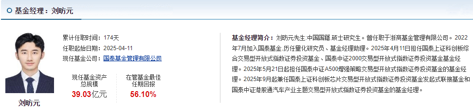 这只基金的经理是刘昉元,他有着扎实的投研背景,之前曾在浙商基金担任量化研究员和基金经理助理,经验非常丰富。2022年加入国泰基金后,他参与了多个指数基金的管理,担任过多个基金的基金经理,积累了非常多的实战经验。