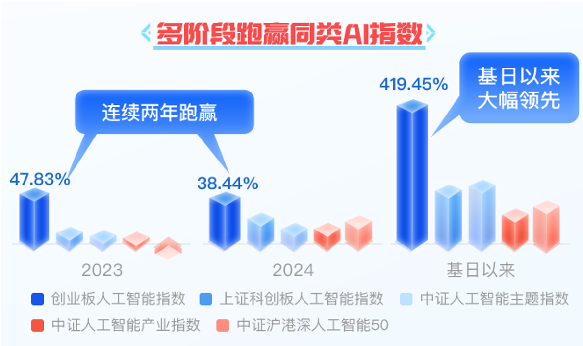 创业板人工智能指数单日涨跌幅可以达到20%,相比主板指数,波动更大,但这对想要捕捉AI投资机会的人来说,反而是一种优势。过去两年,这个指数的表现持续领先同类,基日以来涨幅已经超过419%。从历史数据看,它已经证明了自己的成长性。