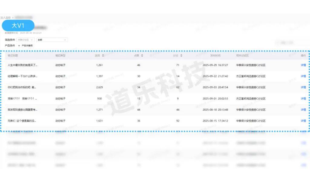 在确认“大V1”的粉丝规模、互动率与阅读量等核心数据后,还可以进一步点开其详情页,追踪该达人近期的