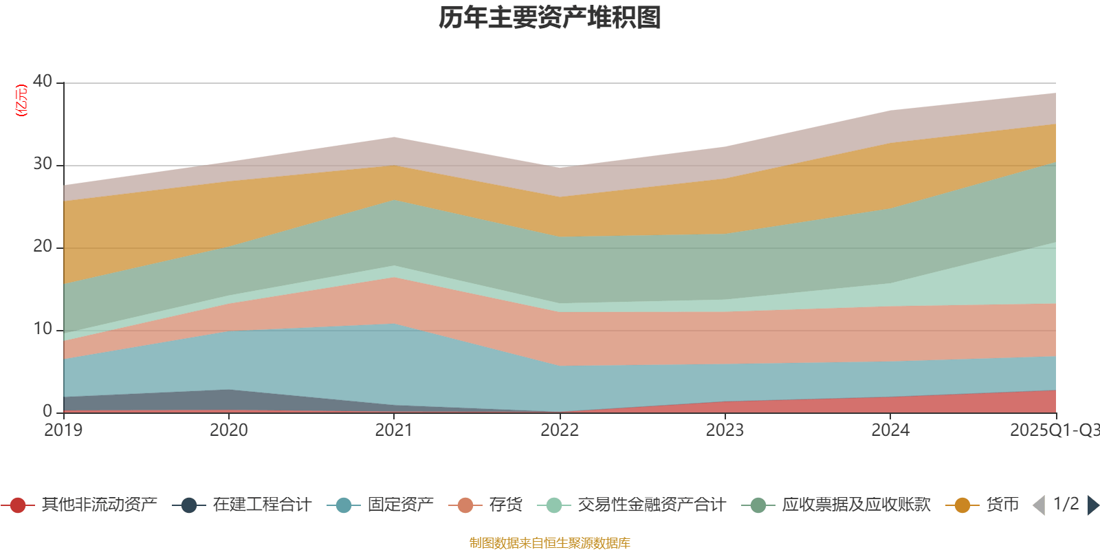 资产重大变化方面,截至2025年三季度末,公司交易性金融资产合计较上年末增加166.33%,占公司总资产比重上升11.58个百分点;货币资金较上年末减少41.7%,占公司总资产比重下降9.73个百分点;其他非流动资产较上年末增加43.61%,占公司总资产比重上升1.83个百分点;存货较上年末减少4.43%,占公司总资产比重下降1.76个百分点。