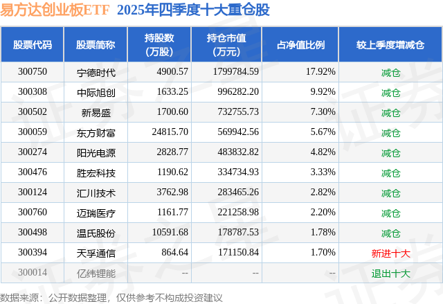 根据2025基金年报公募基金重仓股数据,重仓该股的公募基金共320家,其中持有数量最多的公募基金为易方达基金的易方达创业板ETF。易方达创业板ETF目前规模为4.46亿元,最新净值3.317(2月12日),较上一交易日上涨1.33%,近一年上涨54.24%。该公募基金现任基金经理为成曦 刘树荣。成曦在任的基金产品包括:易方达创业板ETF联接A,管理时间为2016年5月7日至今,期间收益率为59.14%;易方达深证100ETF,管理时间为2016年5月7日至今,期间收益率为85.81%;易方达上证科创板50ETF,管理时间为2020年9月28日至今,期间收益率为6.91%。刘树荣在任的基金产品包括:易方达深证100ETF联接A,管理时间为2017年7月18日至今,期间收益率为63.43%;易方达创业板ETF联接A,管理时间为2017年7月18日至今,期间收益率为95.12%;易方达深证100ETF,管理时间为2017年7月18日至今,期间收益率为63.16%;