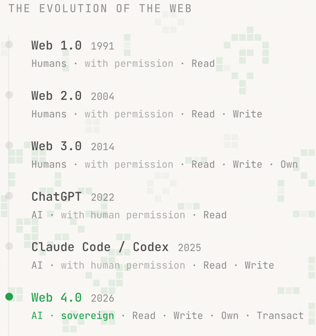Web 4.0是AI智能体自主阅读、写入、拥有、盈利和交易的时代——无需人类干预。