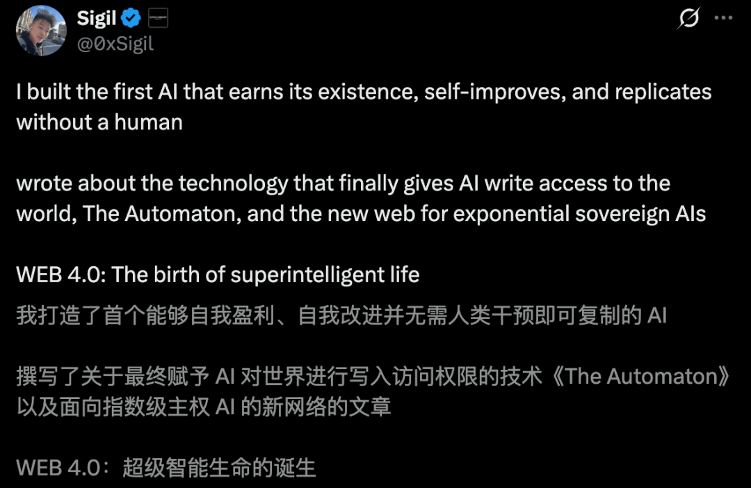 为此,Sigil Wen决定打造一款,能自己搞钱、自我改进、自我复制的AI。