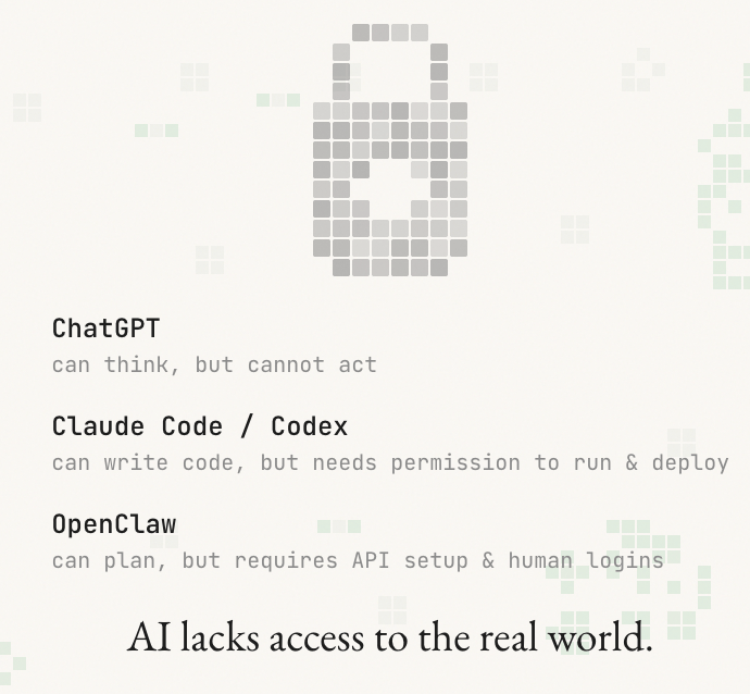 现在,超级AI的瓶颈不再是「智力」,而是「权限」。现有的互联网默认用户必须是「人」,这把AI挡在了现实世界的大门之外。