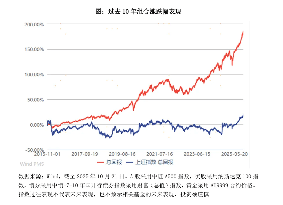 过去10年,组合累计回报183.48%,显著跑赢上证指数的16.92%,历史年化回报近11%。与投资单一资产相比,多元化投资能丰富组合收益来源,不仅能赚A股的钱,还能获得来自美股、债券和黄金的收益。