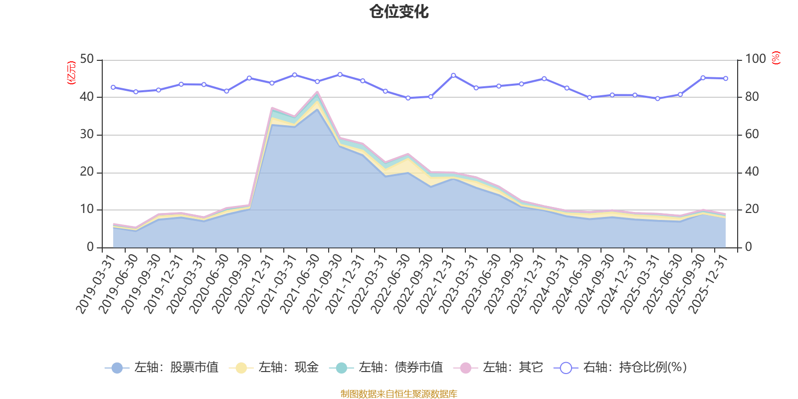 据定期报告数据统计,近三年平均股票仓位为84.77%,同类平均为86.12%。2021年三季度末基金达到92.2%的最高仓位,2025年一季度末最低,为79.39%。